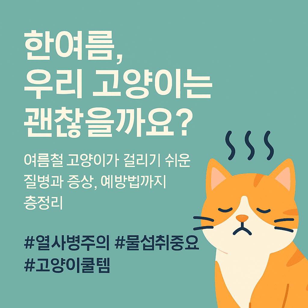 여름철은 보호자의 작은 관심 하나로 고양이의 건강을 지킬 수 있는 시기입니다. 우리 고양이가 시원하고 건강한 여름을 보낼 수 있도록, 지금부터 하나씩 체크해보세요!